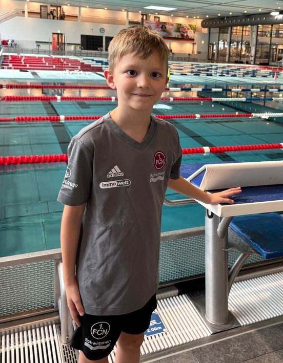 Er ist seit dem 29. September 2025 Mitglied beim FCN Schwimmen und damit unser 1.000stes Mitglied. Herzlich willkommen, Dennis Müller! Mit seinen 7 Jahren, viel Motivation und Talent trainiert Dennis in der 6. Mannschaft von Katja Chang, zusammen mit weiteren Nachwuchstalenten. Als kleines Willkommensgeschenk erhielt Dennis aus den Händen von Vorstand Claus Swatosch ein passendes T-Shirt und eine Club-Hose.