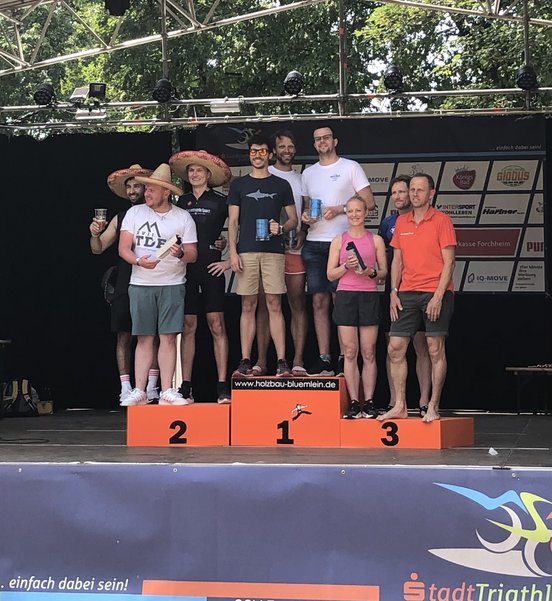 Schon zum zweiten Mal hat Florian Kassner, Fachwart der FCN Masters, mit Arbeitskollegen am Stadttriathlon in Forchheim teilgenommen. Nach einem hervorragenden zweiten Platz im vergangenen Jahr holte er sich am 18. Juni 2023 mit einer anderen Staffel den ersten Platz im Forchheimer Königsbad. Mit einer großartigen Zeit von 1:00:12,00 Stunden kam Läufer Gaspar Ramoa als Erster ins Ziel. In ihm steckt damit nicht nur ein guter FCN-Schwimmer, sondern auch ein ehrgeiziger Läufer. Den Schwimmpart hatte Florian Kassner übernommen, die Radstrecke sein Arbeitskollege Daniel Bauernschmitt. Insgesamt war eine Distanz von 500m Schwimmen, 19km Radfahren und 5km Laufen zu absolvieren. Gewonnen haben sie einen Freistart für den Forchheimer Triathlon 2024, es wird also auf jeden Fall eine Titelverteidigung geben.