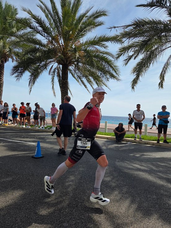 Nach dem Schwimmen im 25°C warmen, türkisblauen Wasser der-Bucht von Nizza, ging es auf anspruchsvollen Radkilometern mit vielen Höhenmetern aufs Plateau hinter Nizza. Dort oben war es dann schon sehr böig, was sich später beim Laufen entlang der Promenade durchzog. Auf der 5,5km langen Promenade, die vier Mal zurückgelegt werden musste, wehte ein ständiger Westwind, so dass die Wende kurz vor dem Flughafen Nizza von den meisten Teilnehmern herbeigesehnt wurde.