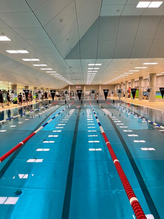Bei Temperaturen von über 30 Grad, war es für die 15 Sportler und ihre Trainerinnen schon fast eine Genugtuung, dass sie den Tag in der Olympiaschwimmhalle in München verbringen durften. Fast 180 junge Sportler haben sich diesmal im Nebenbecken versammelt, um gemeinsam bei einem LVT, die geforderten Werte für ihre Kadersichtung zu erreichen.