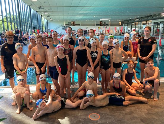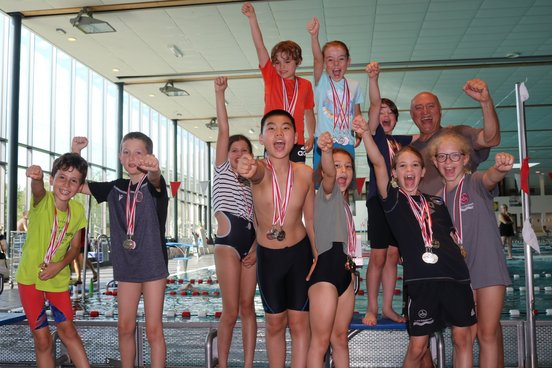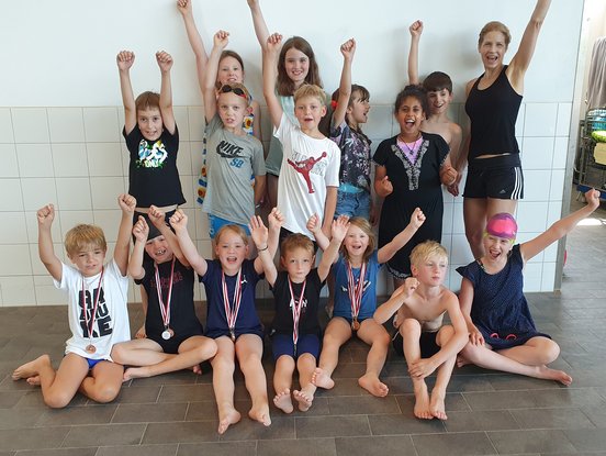 Auch unsere Kleinsten waren mit am Start und präsentierten stolz, was sie bereits gelernt haben. Da noch kein Meister vom Himmel gefallen ist, war es beim einen oder anderen zwar noch etwas schwierig, z.B. den Abstand zur Wand bei einer Rollwende abzuschätzen, aber überwiegend klappte es prima und die Ergebnisse konnten sich sehen lassen. Katja war rundum zufrieden mit Linnea Bschirrer (2018), Leon Brand, Simon Hager, Lilith Kluever (2017), Moritz Amtmann, Yeliz Aydin, Valentin Koepnick, Valentin Mederer (2016), Elyas Mourad, Laurenz Schaberg (2016), Philomena Velke und Ayla Yemane (2015) und etliche konnten sogar schwer behangen mit Medaillen am Ende das Bad verlassen. Nun sind sie bestens vorbereitet, um in die neue Saison zu starten und an ihre Erfolge anzuknüpfen.