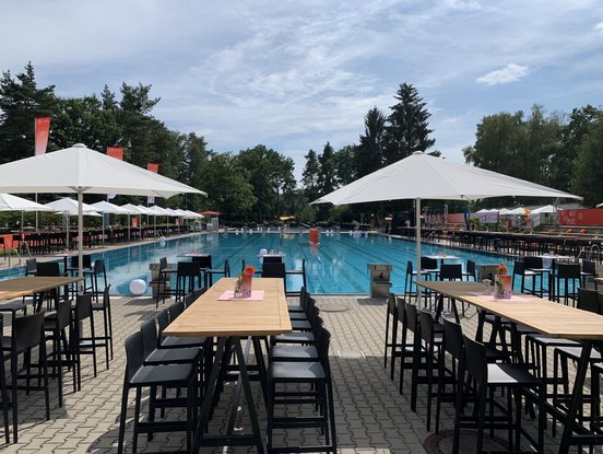 NürnbergMesse wird 50 Jahre, lädt alle Mitarbeiter weltweit ein und feiert eine tolle Party mit rund 900 Gästen im Clubbad. Das Wetter hätte an diesem Donnerstag den 25. Juli nicht besser nicht sein können, das 50m lange Buffet und die zahlreichen Stände, verteilt im ganzen Bad, boten kulinarische Topqualität des Caterers „Keepers and Cooks“ und diverse DJs und Bands brachten das Messeteam in Feierstimmung. Klasse war auch die Feuershow am Beckenrand. Es wurde viel getanzt (zwischen den beiden Becken) und auch die beiden Schwimmbecken wurden von den Feierenden für diverse Abkühlungen in Bekleidung genutzt.