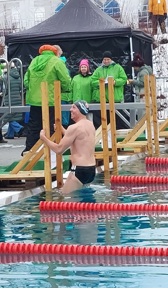 Der Eisschwimm-Erfahrenste, Didi Gradel, steigerte sich wie letztes Jahr angekündigt bei der Distanz und so standen neben den gewohnten 100m und 50m Freistil sowie der Staffel zum ersten Mal die 200m Freistil an. Wie von einem ehemaligen deutschen Meister im Eisschwimmen zu erwarten, beendete er alle Läufe auf dem Podest. Und auch bei den 200m stieg er lachend aus dem Wasser. Stehen da nächstes Jahr die 250m an?