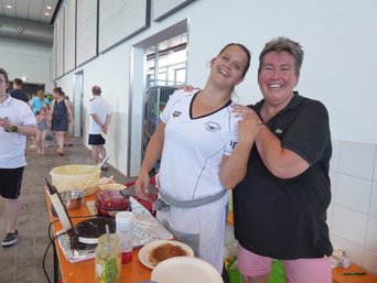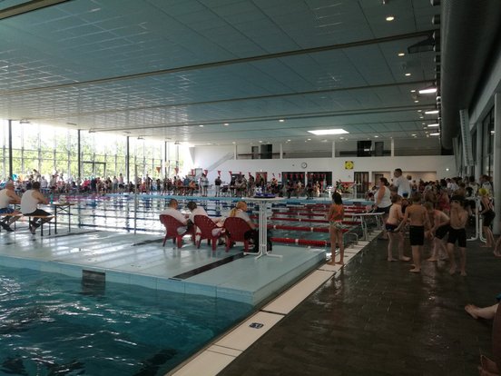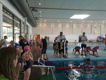 „Viel trinken, die Sonne an der Fensterscheibe meiden“ waren gut gemeinte Ratschläge von Katrin Fottner bei der Begrüßung, die einige von den kleineren sehr wohl beherzigten – sie tranken unseren Getränkestand leer und stürmten anschließend zum Getränkeautomaten in der Empfangshalle. Sportlich ging es mit dem Einschwimmen um 11 Uhr los, dann kam spätestens die ganz große Aufregung. Viele Schwimmerinnen und Schwimmer bestritten ihren allerersten Wettkampf und wussten noch nicht, wie sie sich aufwärmen sollten, oder wann und wo sie zum Start gehen sollten.